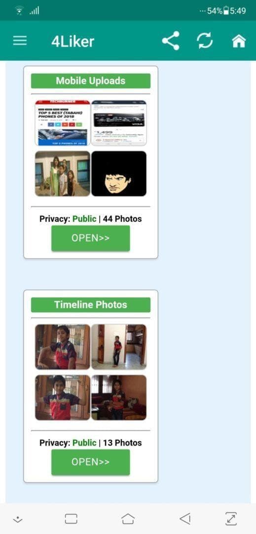 If you select Auto Liker, you will get a new welcome screen with new navigation buttons such as Home, Status, Feed, Photos, Videos, or Custom Id. Select one which you need to get likes (select photos to get likes on photos, a video for videos and respectively); for demonstration, I am using photos. After selecting, you would see a screen showing all your Facebook albums; select which album you need, and click open. Then it will show you all the photos or videos inside the album, choose your photo and click select and you are done. You can follow the same steps for Instagram as well.